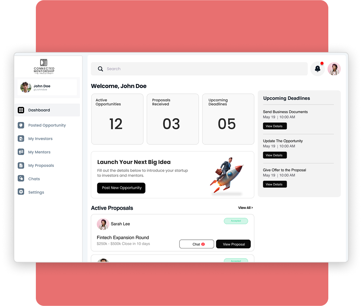 Connected M&I is not simply a platform; it brings people together and helps them build real relationships. We break down traditional barriers and create an environment where visionary entrepreneurs, strategic investors, & experienced mentors can easily collaborate and build trust. You can communicate key ideas, connect with people who share your vision, and should celebrate each success, knowing that the community is there to support your goals.